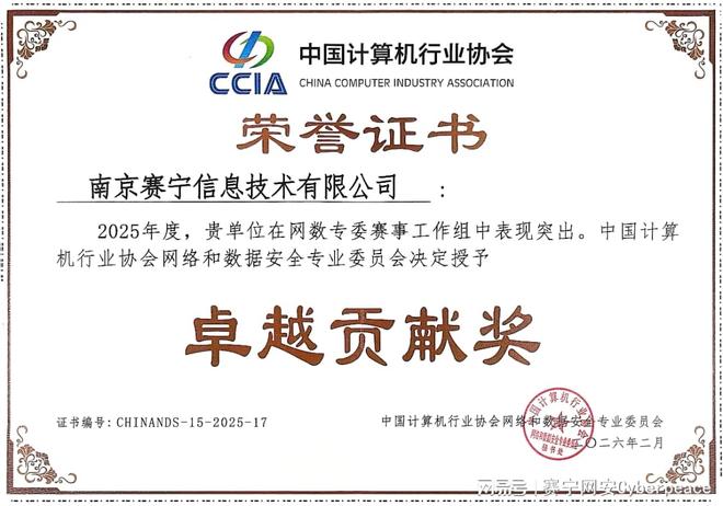赛宁应邀出席,并凭借在安全领域持续的创新实践与显著贡献,荣膺中国计算机行业协会网数专委授予的2025年度“卓越贡献奖”,这一荣誉不仅是对赛宁过去一年成绩的高度认可,更彰显了其作为行业发展中流砥柱与创新引擎的关键角色。